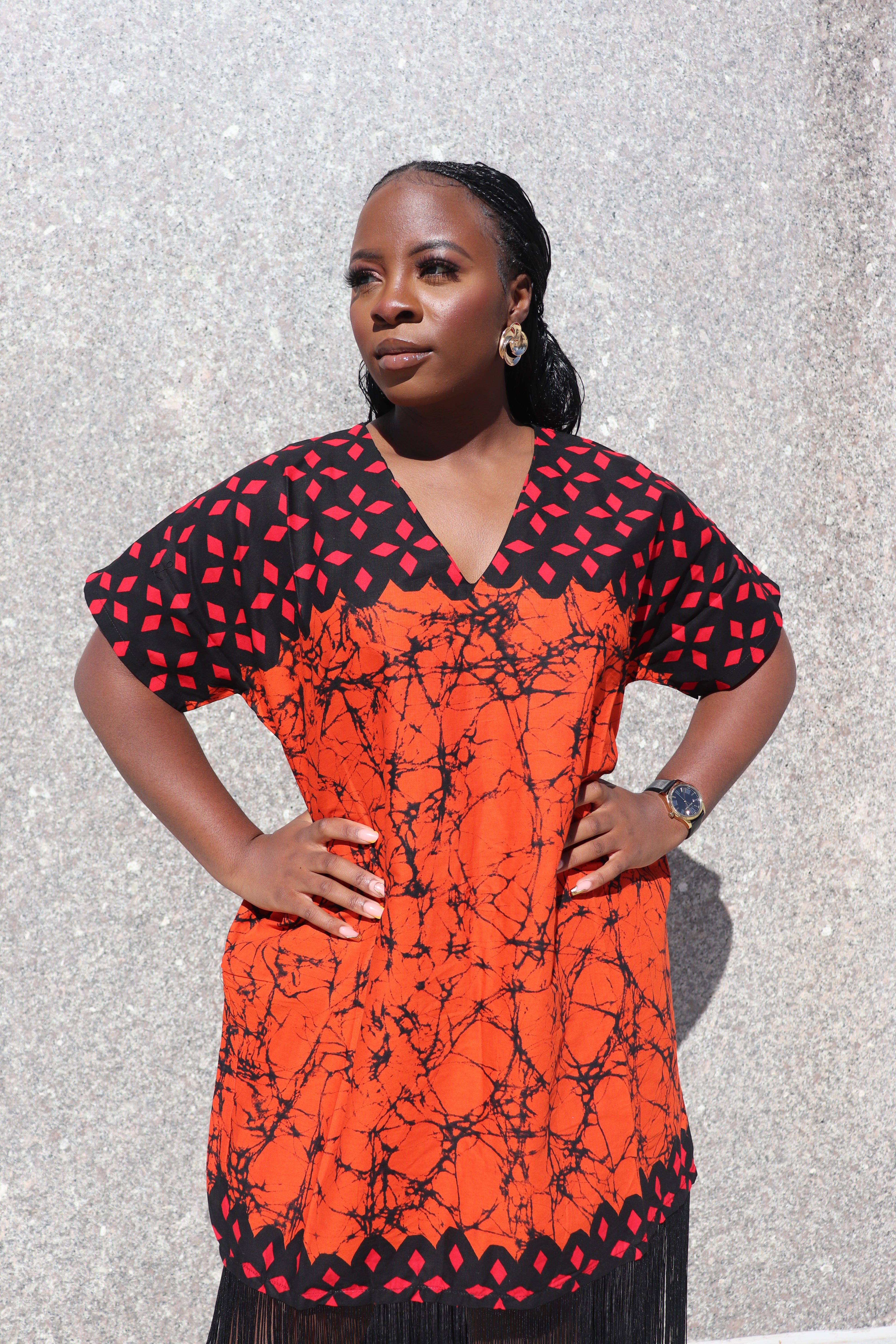 The Imani Dress is a statement of strength and grace. Designed with a vibrant orange Ankara print, a flattering V-neckline, and bold fringe detailing along the hem, it flows beautifully with every step. Equal parts playful and powerful, it’s perfect for nights out, events, or any moment you want to stand tall in your truth.